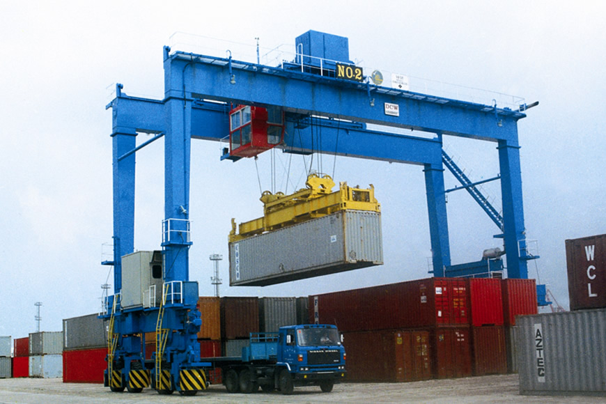 轮胎式集装箱门式起重机方面,大连重工研制的该类产品适用于国际标准集装箱的搬运及装卸,设备性能先进,机动性好,对地面不平度敏感性小。目前产品主要机型为吊具下30.5吨—45吨。